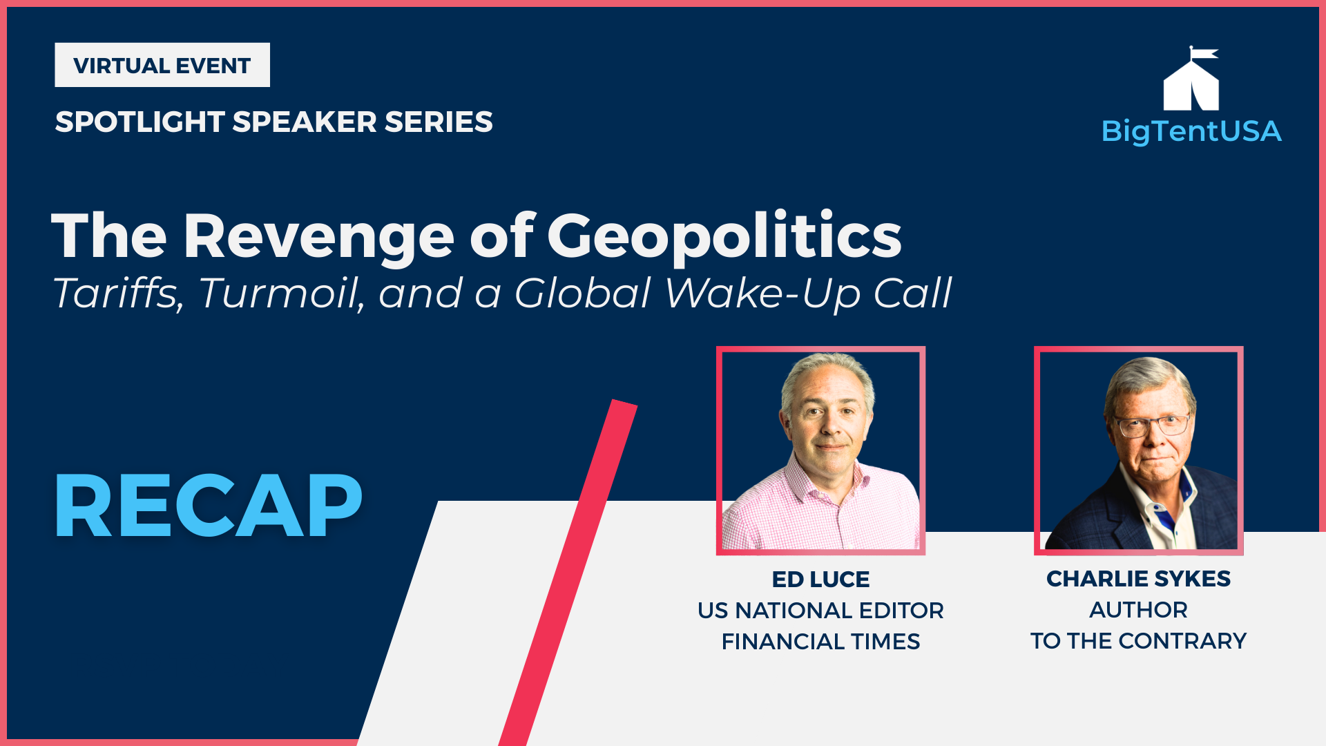 BigTentUSA was honored to host an urgent and “must listen to” conversation with Ed Luce, U.S. national editor and columnist for the Financial Times, and Charlie Sykes, founder and former editor-at-large of The Bulwark and now the Substack Newsletter To The Contrary.